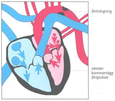 AortacoarctationAortacoarctation är en förträngning i kroppspulsådern som medför att vänster kammares muskel förstoras. Blodtrycket i övre kroppshalvan blir för högt medan blodtrycket i den nedre halvan blir för lågt.